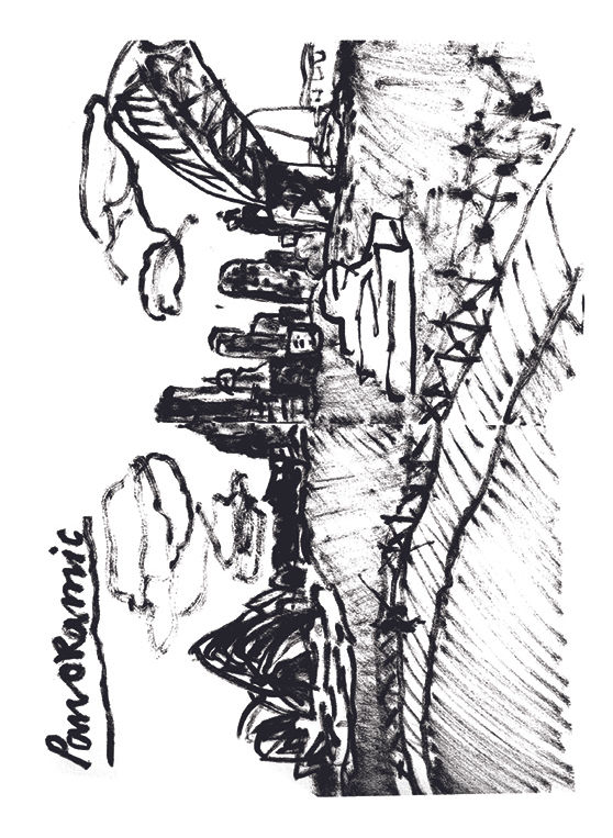 Initially one sees a daytime view looking up at the “North and south heads” on Sydney harbour. When flipped 180 degrees the viewer sees a night time view , down towards the harbour immediately adjacent to the heads , from a parapet at “Middle head”:a series of military trenches & canons installed by the colony to repel invading armies, post 1788. This anamorphic painting transports the viewer to different times & use of land pre and post colonisation, through morphosis. A myriad of perspectives, past & present tense, literal and figurative,day vs night & man made vs natural protective barriers